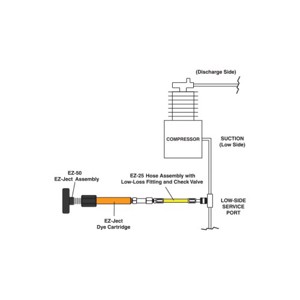 - Cost effective — Each disposable EZ-Ject™ dye cartridge treats up to 2 gallons (7.6 L) of lubricant or 25 lbs (11.3 kg) of refrigerant.No pouring, no refrigerant, no spills — Prefilled EZ-Ject™ cartridges are clearly labeled with 14 calibrations so you’ll introduce exactly the right amount of dye every time! When the cartridge is empty, just throw it away. A new one connects in seconds..